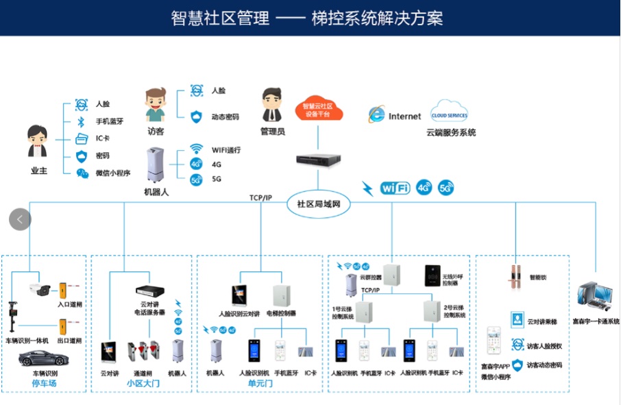智慧社区整体解决方案集物联网、云计算、大数据、智能算法等多种技术,将社区安防管理、物业管理、社区O2O、邻里社交、智能家居等服务模块融合统一。