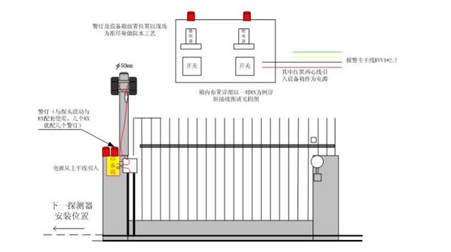 侧面安装则是将探头安装在栅栏,围墙靠近顶部的侧面,一般是作墙壁式安装,安装于外侧的居多。这种方式能避开小鸟、小猫的活动干扰。